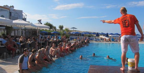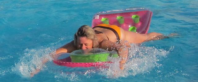 Im Langstrecken Luftmatrazenkraulen – man beachte auch hier die orangene Badehose – wurden leider die letzten Siegchancen verspielt. So endete es – wie vom Damenhochsprung bestens bekannt – mit Platz 4. Es gab also weder eine Flasche Ramazotti noch ne kostenlose Inselwanderung.