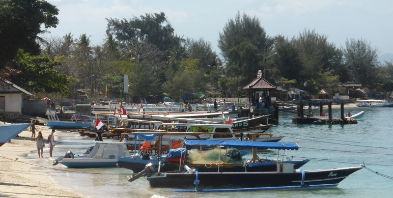 Wir sind jetzt mal 10 Tage auf Tauchstation – heißt, Kommunikation like Amazonas Randgebiet. Also schnell noch ein paar Bilder und Eindrücke von Gili. Das stopover Hotel in Padang Bay war eigentlich viel zu schön für eine Nacht (Aussicht oben). Dennoch wirkt der Ort wie eine Viehtrieb Durchgangsstation der backpacker Bastion gen Gili Inseln.