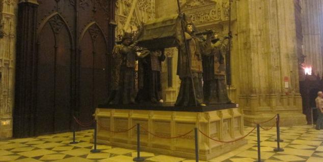An der Südseite findet man das Kolumbus-Grab: Vier Träger – sie symbolisieren Kastilien, Aragon, Leon und Narvarra – von übermenschlicher Dimension tragen einen riesigen Sarg. Nach wiederholten Umbettungen … Achtung Hr. Steinmeier: Plagiat !